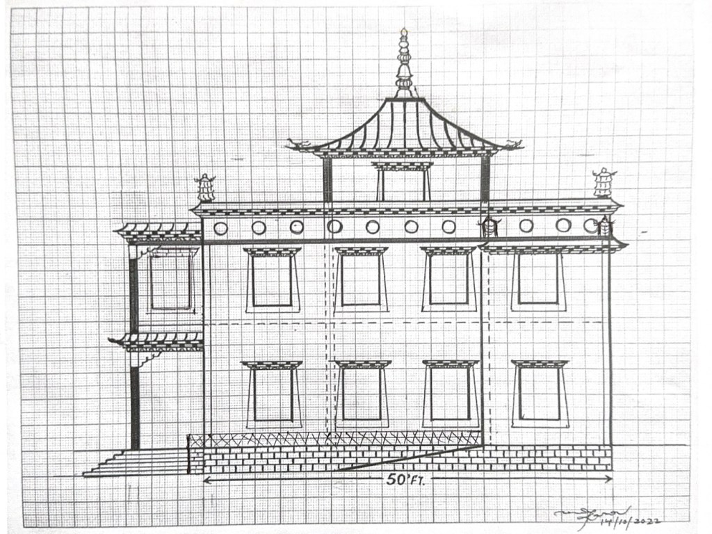 The whole of the Odiyana temple, including the front porch and rear staircase, measures 68’x60′. The main sanctuary of the temple will be 50’x50′. Tulku Orgyen Rinpoche envisions that the capacity of the first floor of the temple will hold around three hundred ordained and lay practitioners. Therefore, for the most part, all participants will be able to gather together inside the temple during group practices and for teachings and empowerments from masters.